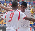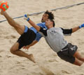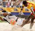 пляжный футбол. Обе команды, несмотря на жару, с самых первых минут